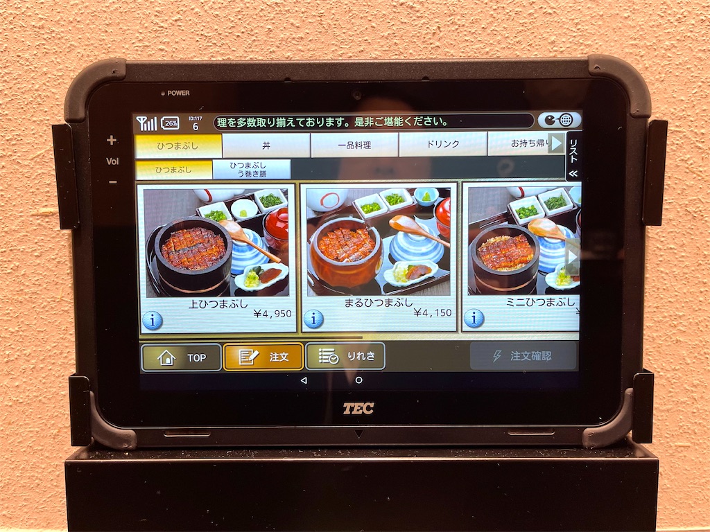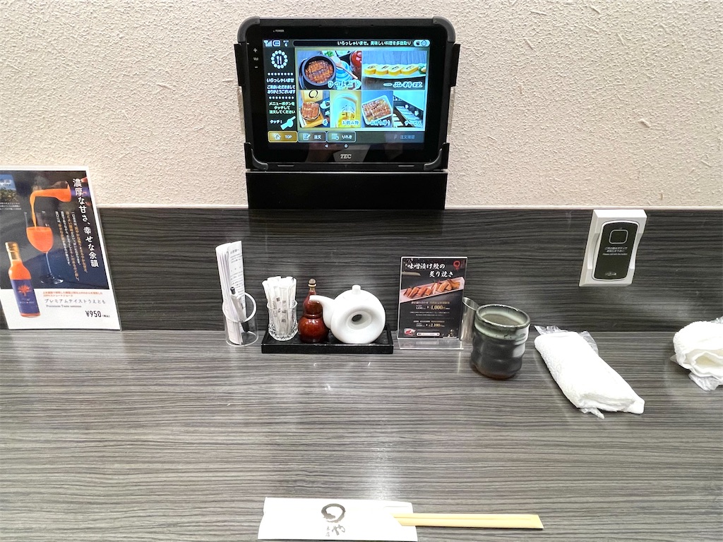 注文はテーブルにあるタッチパネルから。とにかくひっきりなしにお客さんの来るお店では、このシステムはいいのでしょう。