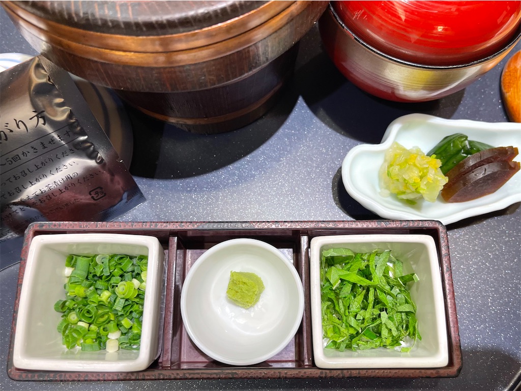 薬味は大葉、ネギ、わさび、刻み海苔。