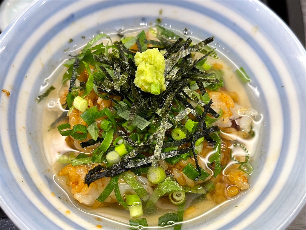 わさびをたっぷりと乗せて、熱々のお出汁をかけると、これまた美味しい〜。