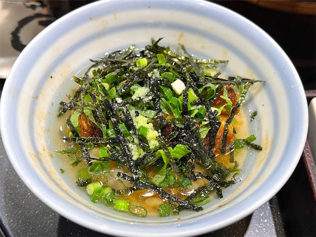 最後は鰻、薬味全部のせにお出汁をかけていただきます。