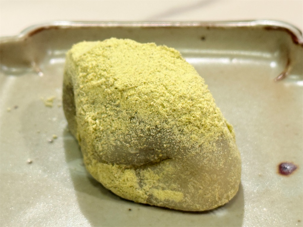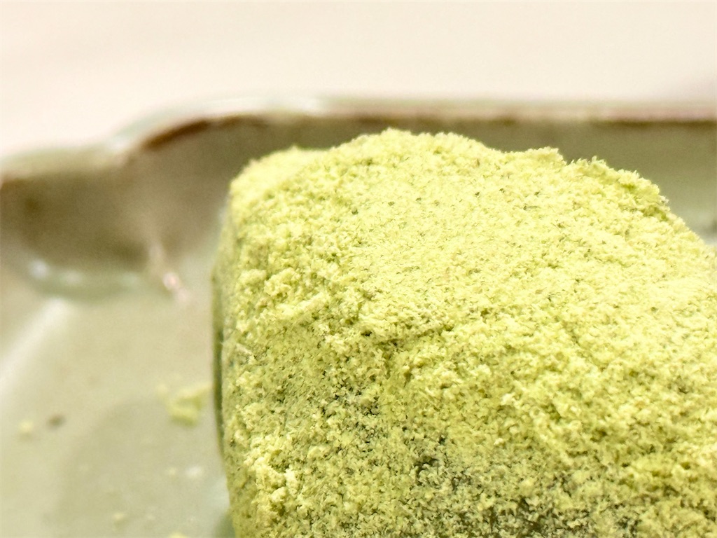 うぐいすきな粉がたっぷり、油断するとパラパラと落ちてしまうので、この風味を逃さぬよう最新の注意を払ってお口へ。